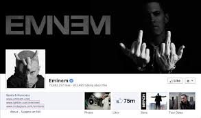 Eminem pode alcançar em breve a incrivel marca de 90 milhoes de fans no FACEBOOK,ele ja ultrapassou a cantor Rihanna que atualmente tem 87 milhoes,e quem se aproxima do rapper é Cristiano Ronaldo com 83 milhoes.